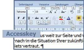 - Schneller geht das Ganze noch mit den Accesskeys, das sind die Buchstaben, mit denen man nach dem Drücken der Alt-Taste ein Menü auch ganz schnell und direkt erreichen kann. Sie werden auch dem blinden Anwender angesagt bzw. ausgegeben.